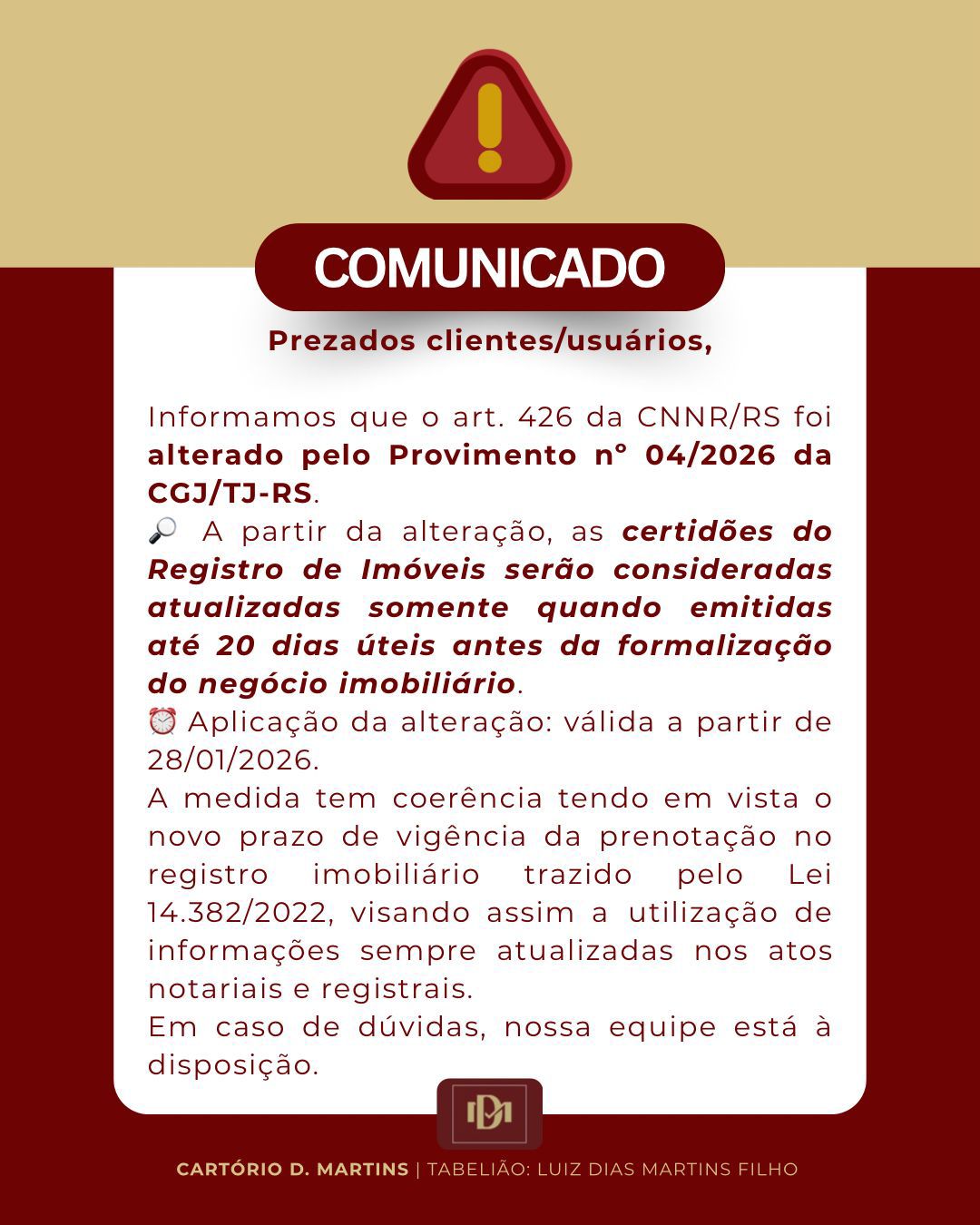 📢 Comunicado Importante O art. 426 da CNNR/RS foi alterado pelo Provimento nº 04/2026 da CGJ/TJ-RS. 📄 A partir...