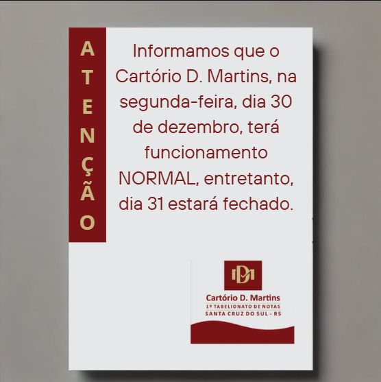 Agradecemos às pessoas especiais, assim como você, que fizeram parte de nossa jornada em 2024!!! Que o ANO NOVO traga ainda mais sucesso, resiliência, solidariedade, união, harmonia e novas conquistas!!! Somos gratos por ter estado conosco em 2024 e esperamos um extraordinário 2025!!! Com gratidão e admiração!!! Fraterno abraço!!! Cartório D. Martins Primeiro Tabelionato de …