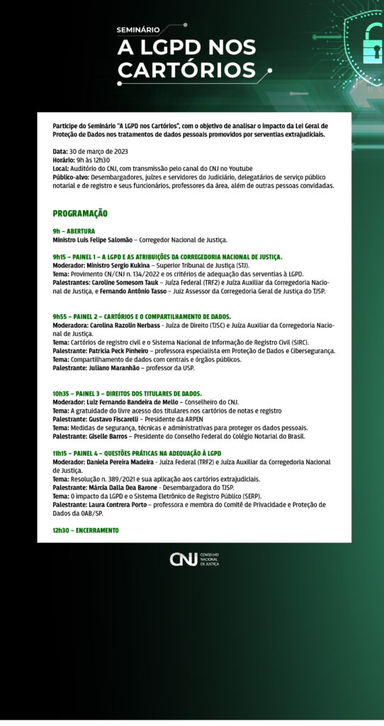 O Conselho Nacional de Justiça realizará o seminário “A LGPD nos Cartórios” no dia 30 de março de 2023. O evento ocorrerá no Auditório do CNJ com transmissão pelo canal do CNJ no Youtube.