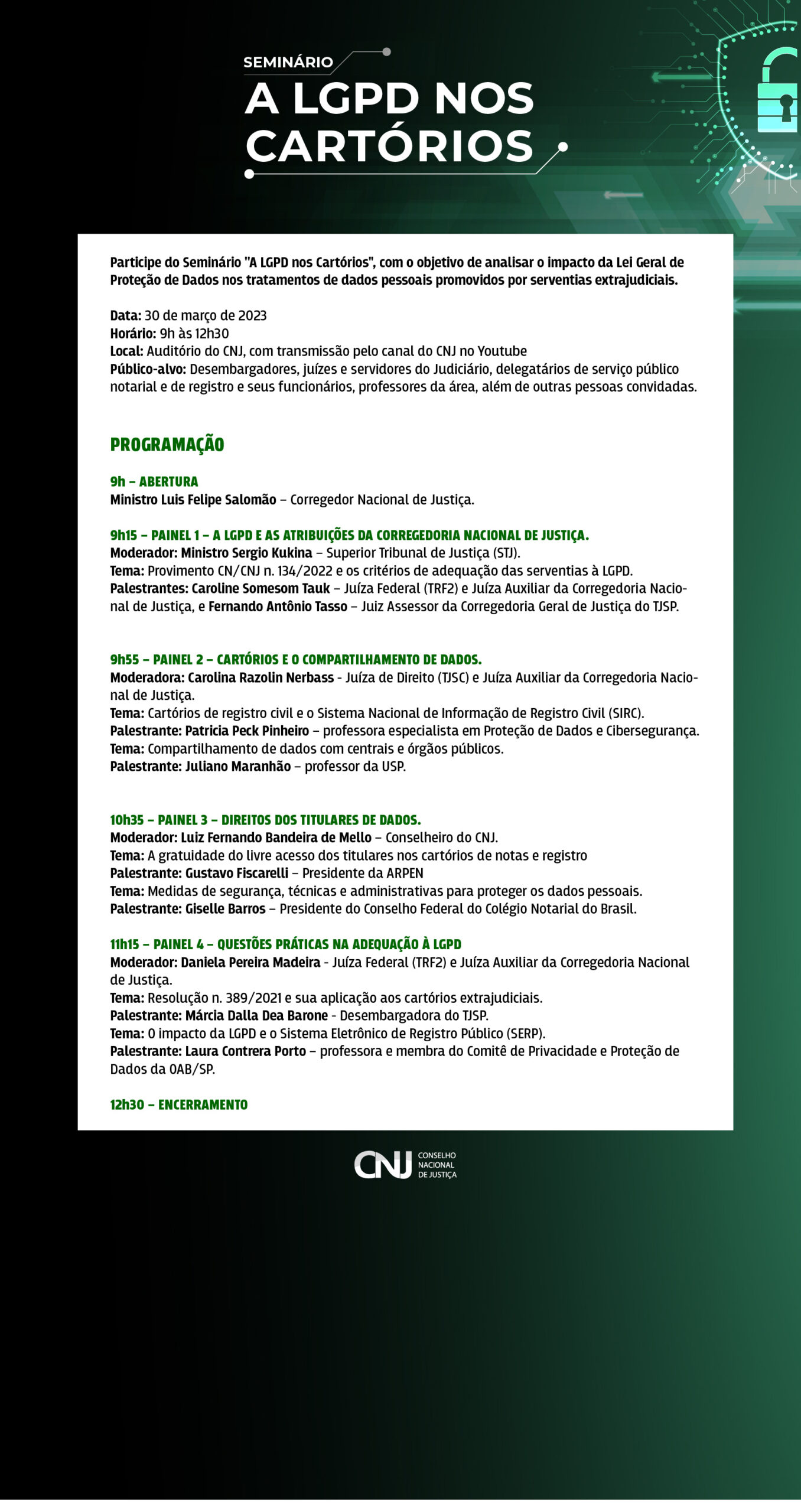 Para mais informações, leia a programação do seminário “A LGPD nos Cartórios” (arquivo em .pdf), publicada em 16/3/2023, às 16h36.