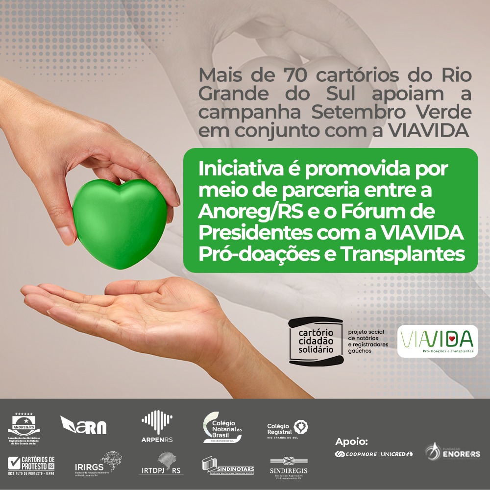A Associação dos Notários e Registradores do Estado do Rio Grande do Sul (Anoreg/RS) e o Fórum de Presidentes das entidades extrajudiciais gaúchas, por meio da VIAVIDA Pró-doações e Transplantes, organização não governamental que atua há mais de vinte anos promovendo a doação de órgãos e tecidos no Estado do Rio Grande do Sul, mantenedora da Pousada Solidariedade, realiza uma ação educativa conjunta com mais de 70 cartórios do estado do Rio Grande do Sul, neste mês de setembro, para mobilização pela campanha Setembro Verde, que visa a conscientização da importância da doação de órgãos.