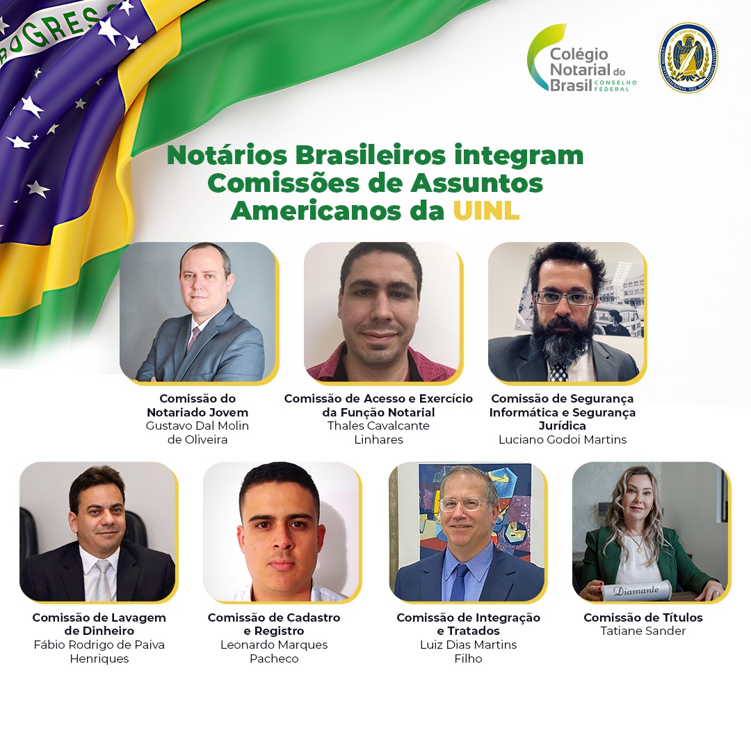 O Conselho Federal do Colégio Notarial do Brasil-CNB/CF apresenta os doze notários brasileiros que representarão o Brasil nos grupos de trabalho da Comissão de Assuntos Americanos da União Internacional do Notariado (UINL) na gestão 2023/2025.