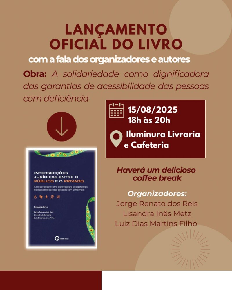 Na próxima sexta-feira, 15 de agosto, das 18h às 20h, venha prestigiar o lançamento do livro: “A solidariedade como dignificadora das garantias de acessibilidade das pessoas com deficiência.”